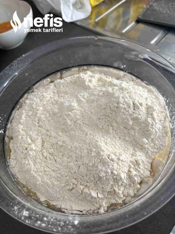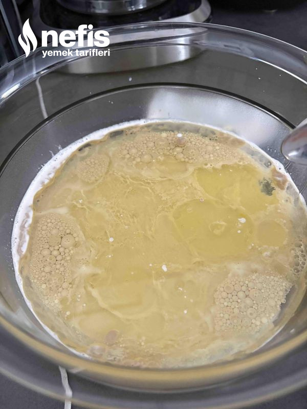 - Şimdi sıcak sütü, sıvı yağını, 3 yumurtanın akışını, tuz ekliyoruz biraz karıştırıp yavaşça ünü ekliyoruz. Ben 5 şu bardağı un kullandım. Hamurumuzu mayalanmaya bırakıyoruz.