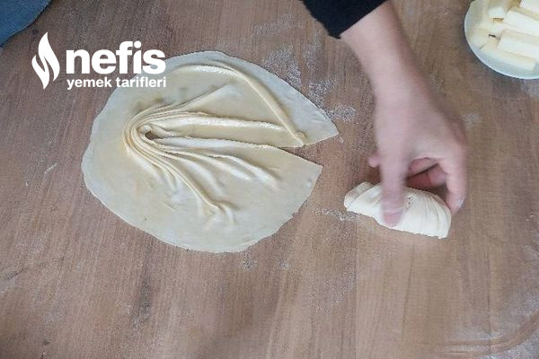 - Ortadan ikiye bölelim görüntüdeki üzere form verip ortasına kaşar peynirini koyarak fırın tepsisine alalım .
