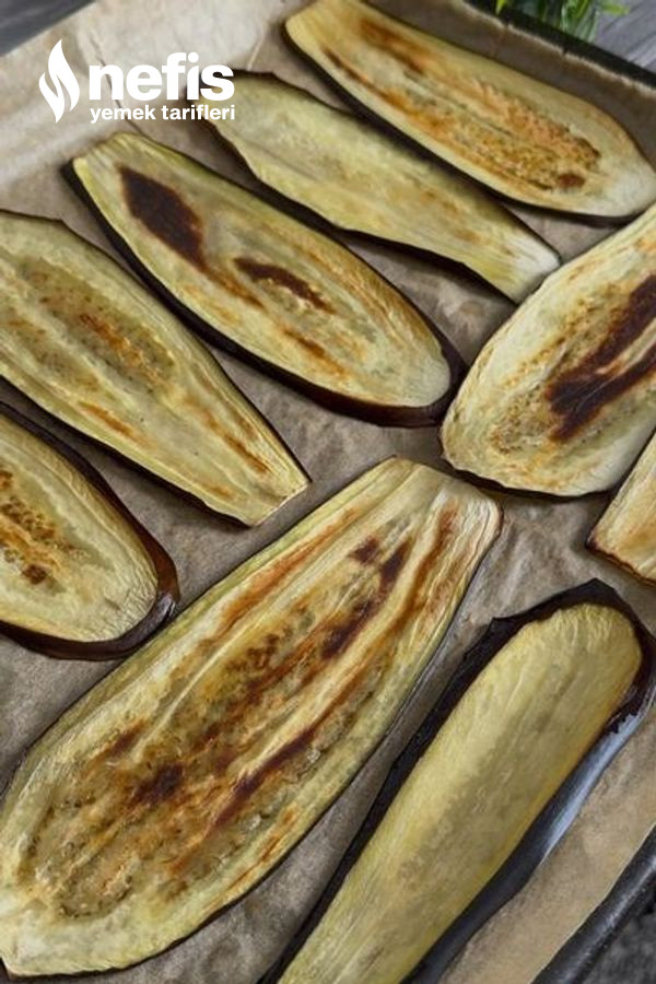 - Diğer yandan patlıcanlar uzunlamasına ince dilimleyelim.