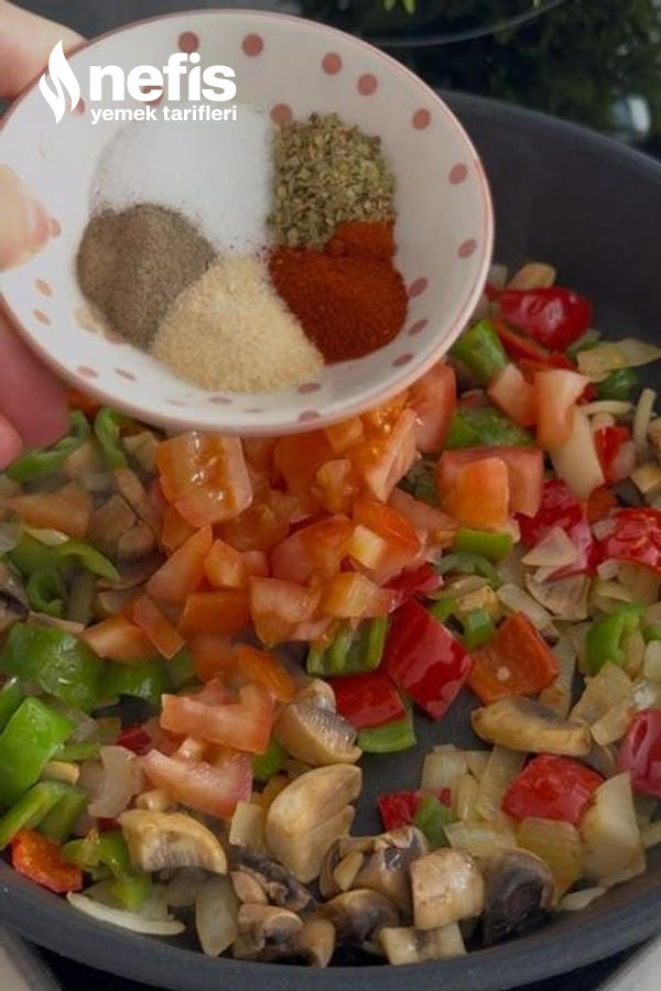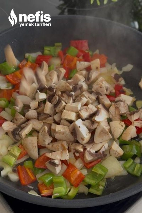 - Küp doğranmış mantarları ve domatesi de ekleyip 2-3 dakika daha kavuralım.