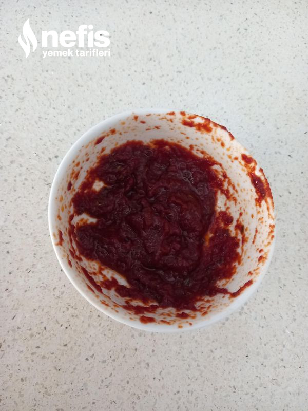 10. Salçayı sürelim üstüne de materyalleri koyalım. Tepsiye dizelim.