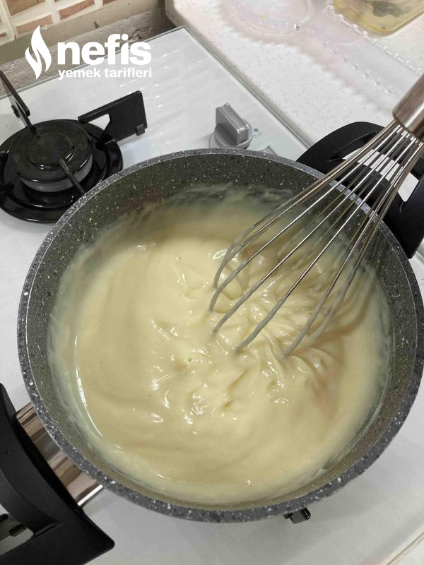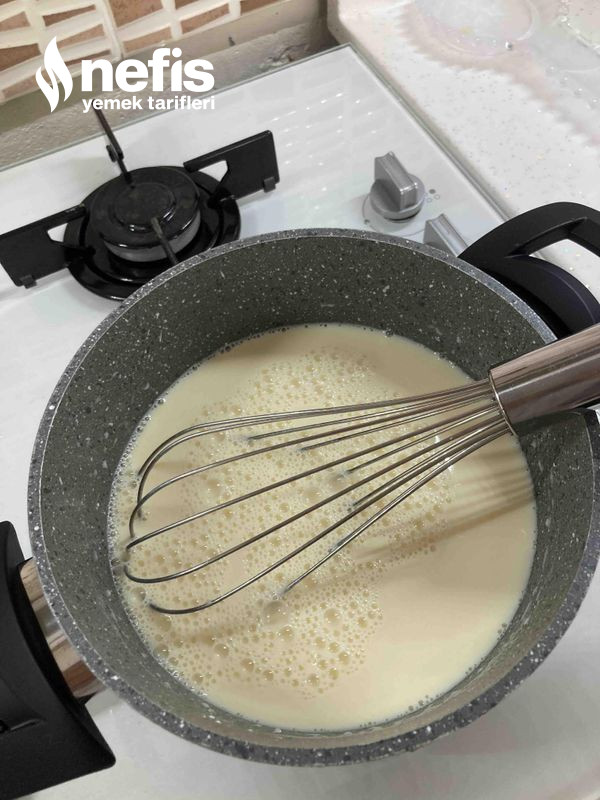 6. Kreması için süt, şeker, yumurta, nişasta ve unu kaynaya kadar karıştırıyoruz.