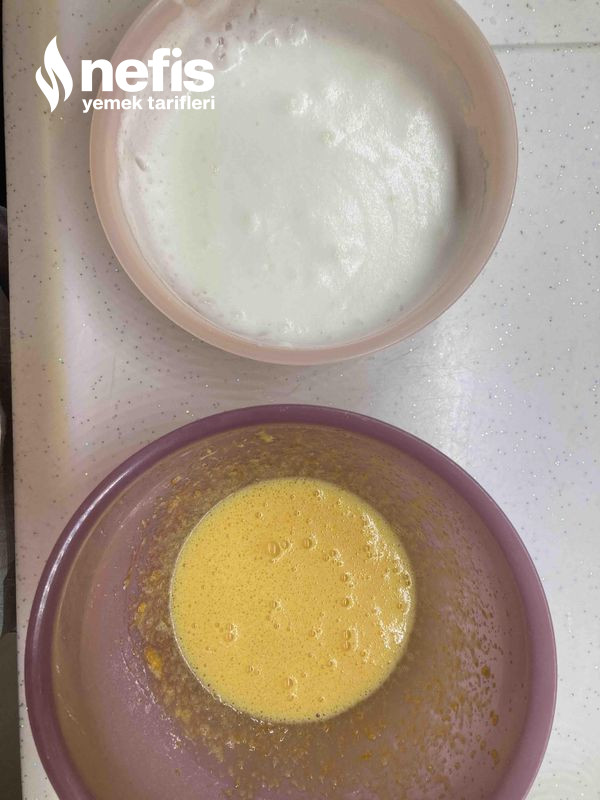 1. Keki için yumurtanın akı ve sarısını ayırıp şekeri ikisine paylaştırıyoruz beyazların içine 1 fiske tuz atıp köpük köpük olana kadar çırpıyoruz.