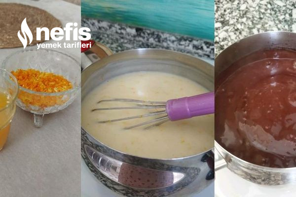 - Tencereye süt, şeker, nişasta ve unu alalım kaynayıncaya kadar karıştıralım. Göz göz olan muhallebiye vanilya tereyağı portakal kabuğu rendesi ve suyunu ekleyelim 1 dakika daha kaynatalım ocaktan alıp ılımaya bırakalım.