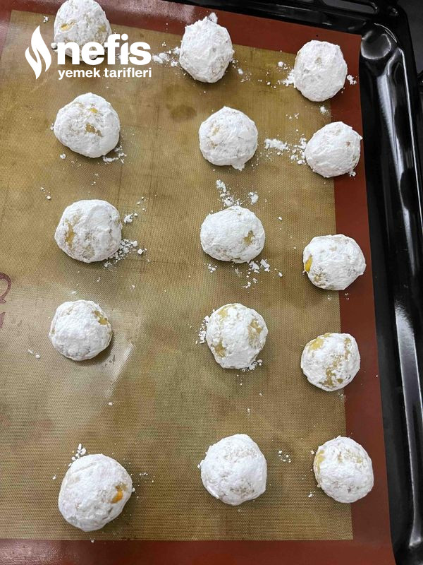 - Tepsimiz dolduktan sonra kurabiyelerimizi tekrar pudra şekerine bulayalım tıpkı süreci iki kez yapmış oluyoruz.