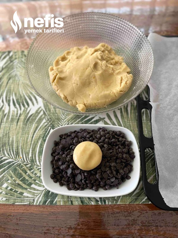 3. Hazırladığımız hamurdan ceviz büyüklüğünde modüller alıp yuvarlayalım damla çikolataya batırıp yağlı kağıt serdiğimiz tepsiye dizelim .