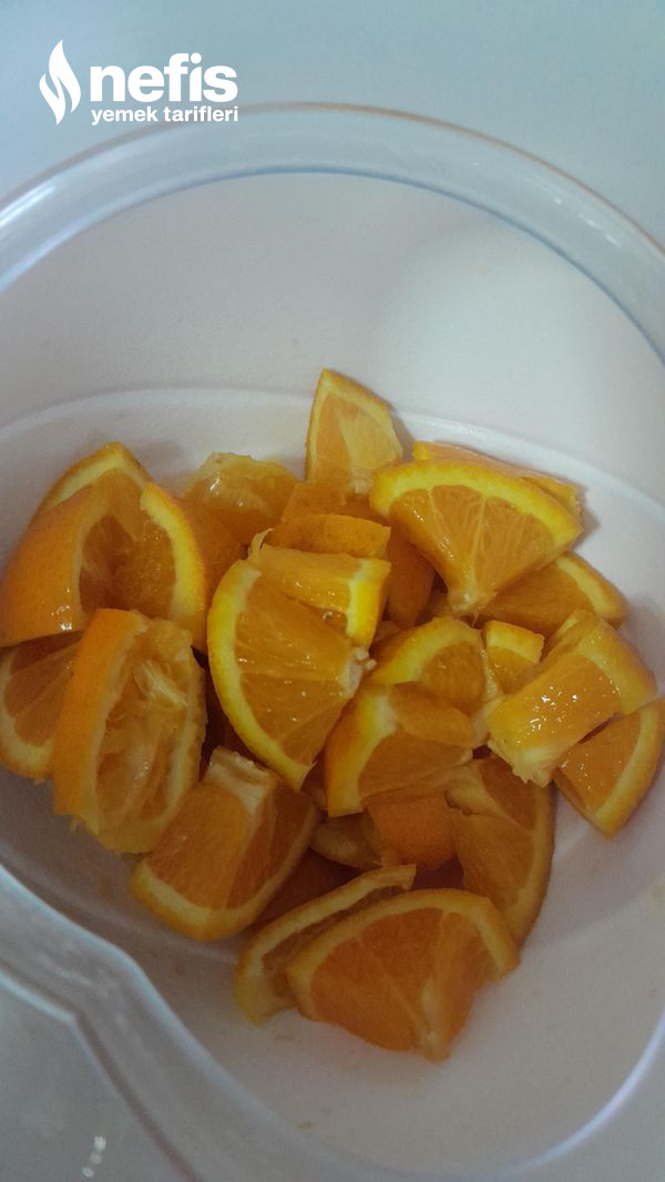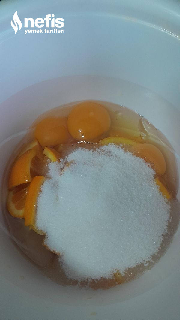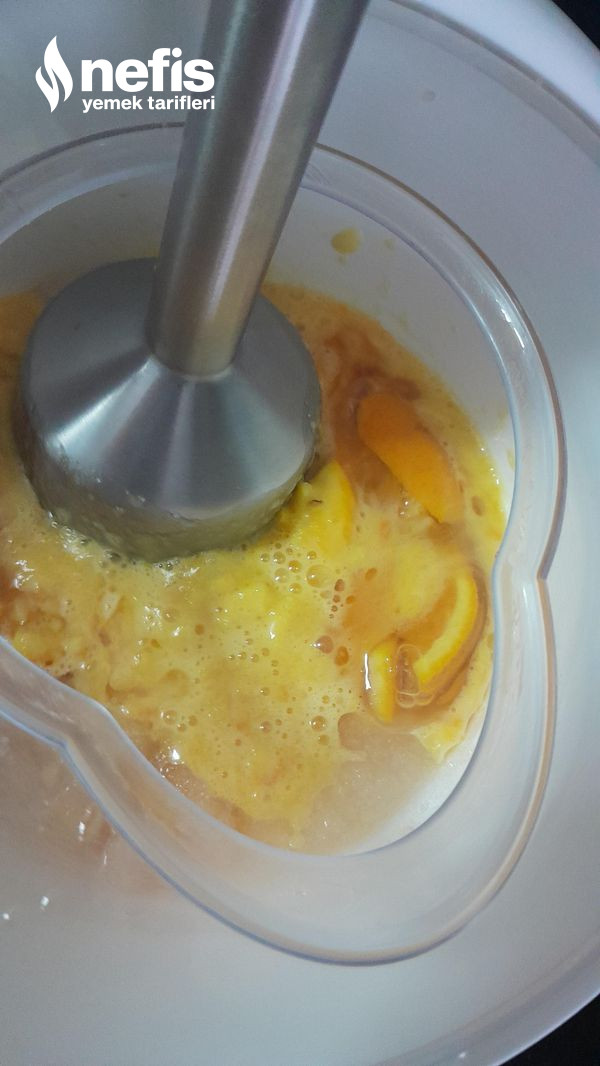 - 1,5 portakal dilimle yumurta, şeker, yağ ekle blender ile karıştır ve parçala.
