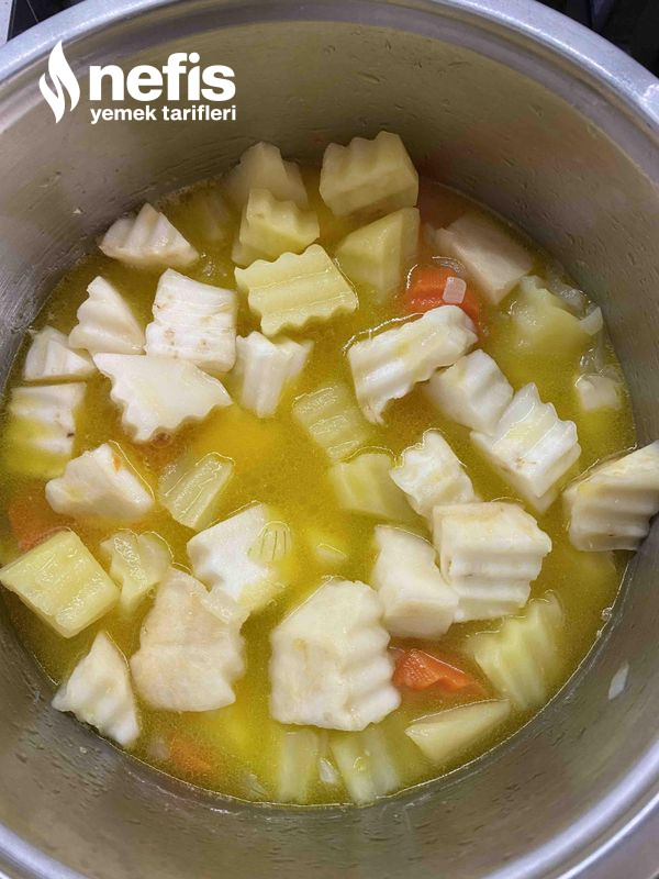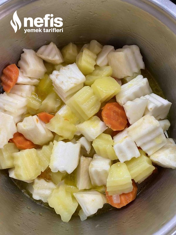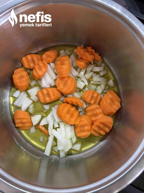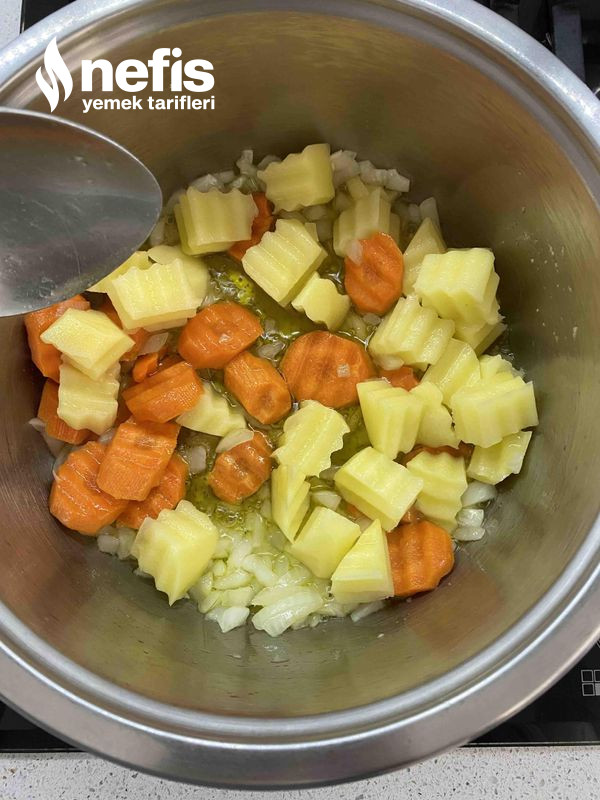 - Soğan, zeytinyağ tencerede alınır. Havuç eklenir, patates eklenir.