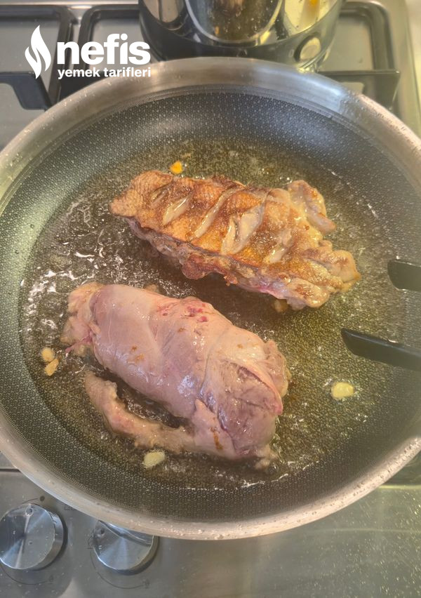 - Bir gece evvelden marine edilen ördeklerin deri kısmına çizikler atıp soğuk tavada evvel derisini kızartarak başlayın, 1 dk sonra çevirip öbür tarafını mühürleyin ve tekrar 1 dk sonra derisi altta kalacak halde ördeği kızartmaya devam edin. Her iki tarafı 5’er dk olacak formda (toplam 10 dk) tavada kızartmaya devam edin.