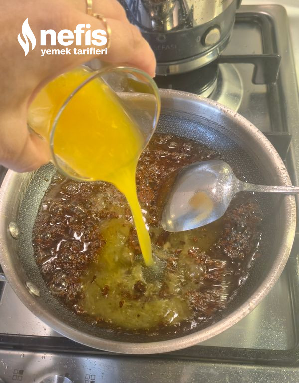 - Ayrı tavada evvel şekeri karamelize edin, üzerine ayırdığınız ördek yağını ekleyin, portakal suyunu, sirkeyi, acı sosunu koyup karıştırın. Sosun koyu olması için un ekleyip son olarak rendelenmiş portakal kabuğunu ekleyin.