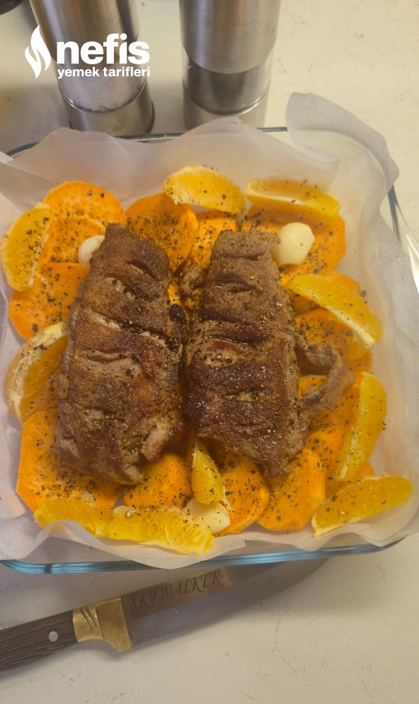 - Ördekleri patates ve portakalın yer aldığı fırın kabı üzerine derisi üste gelecek formda yerleştirin.
