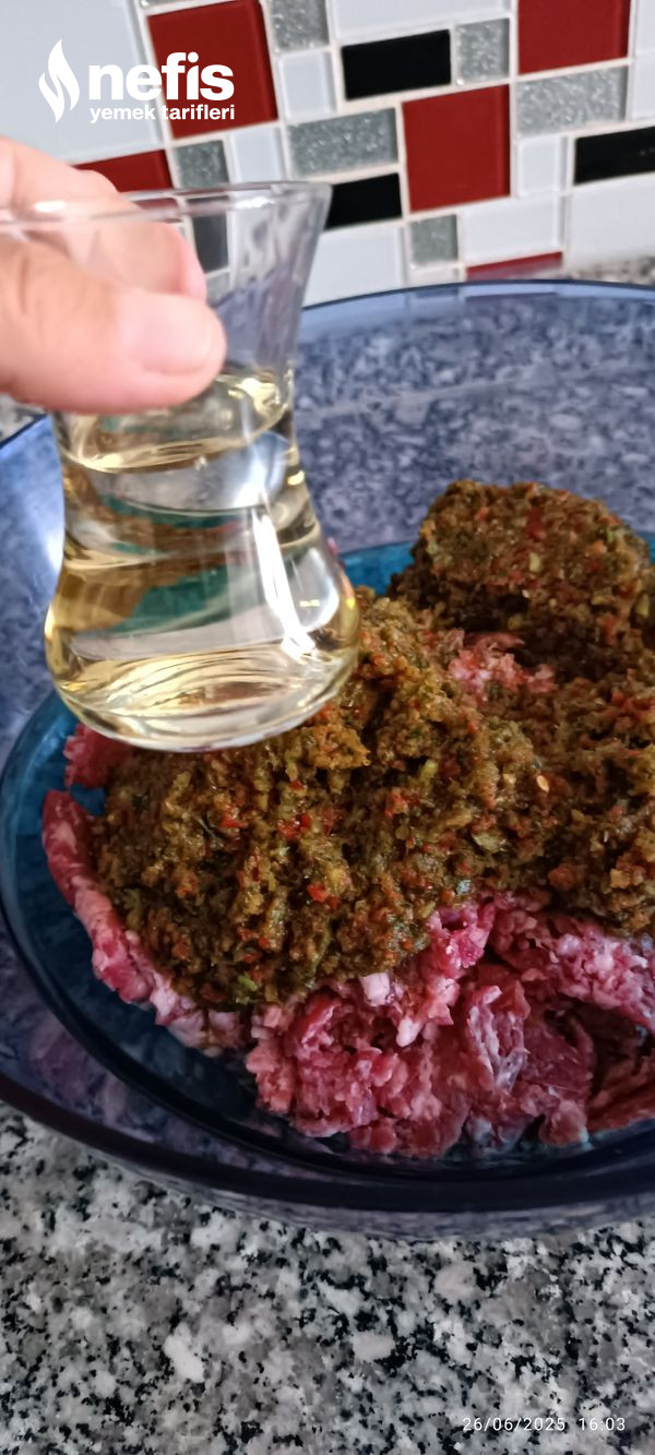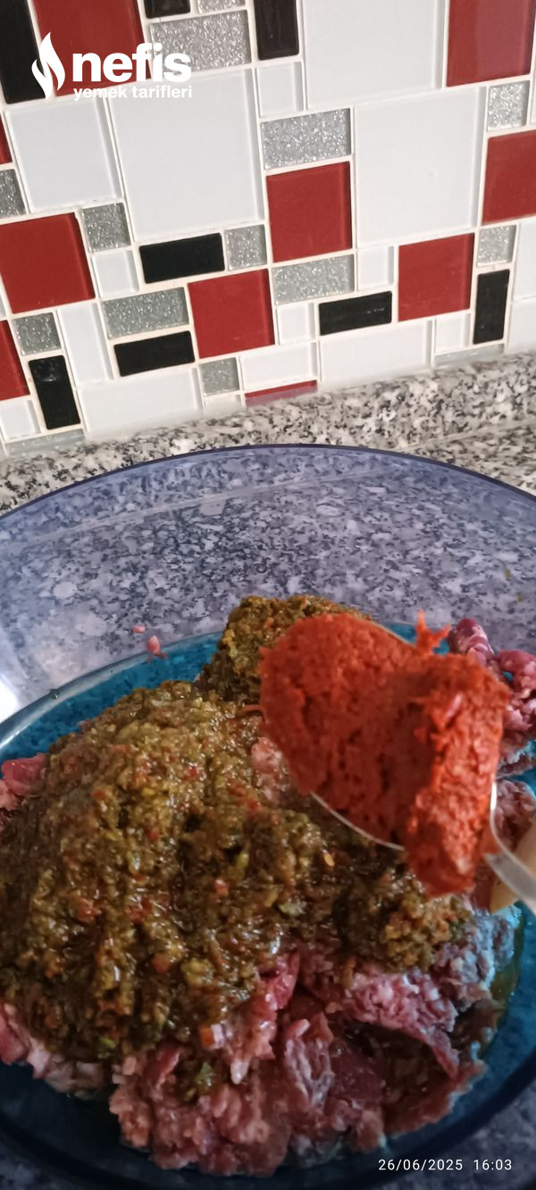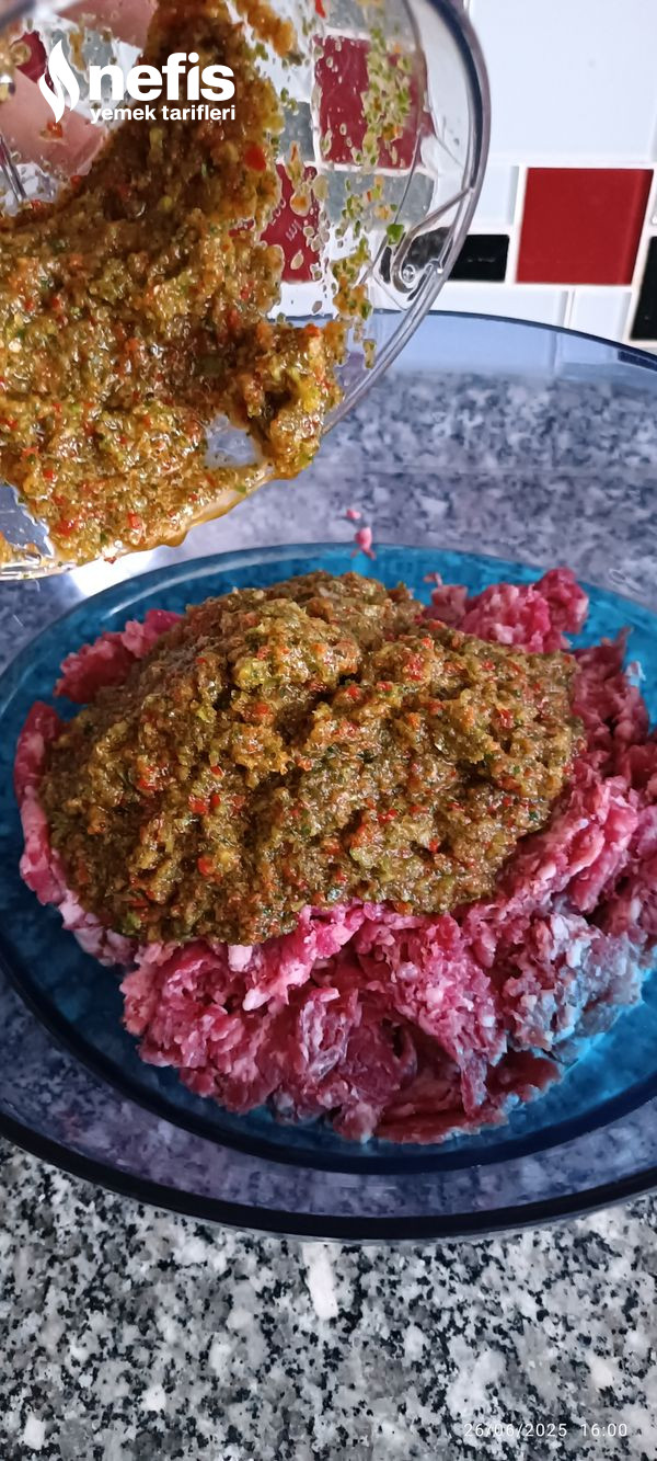 2. Kıymaya rondodan geçirdiğimiz zerzevatları,salça ve sıvı yağı ekleyip güzelce yoğuruyoruz.