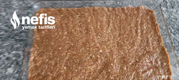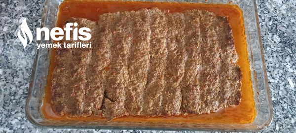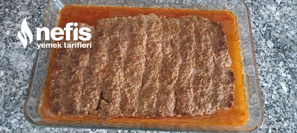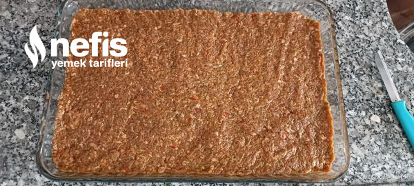 3. Dikdörtgen fırın kabını yağlayıp yoğurduğumuz kıymayı tepsiye yayıyoruz.