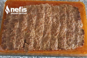 3. Dikdörtgen fırın kabını yağlayıp yoğurduğumuz kıymayı tepsiye yayıyoruz.