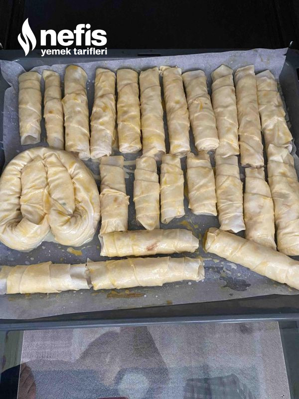 4. Yufka düz bir tabana serilir. Üzerine hazırlanan sos sürülür ve başka yufka üzerine kapatılır. Yufkalar 12 ye bölünür. Yufkaların geniş kısmına 1 yemek kaşığı kadar hazırlanan içten konulur. Kalem formunda sarılır.