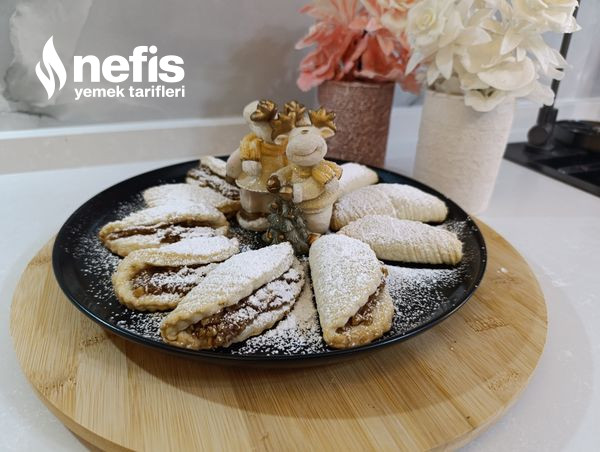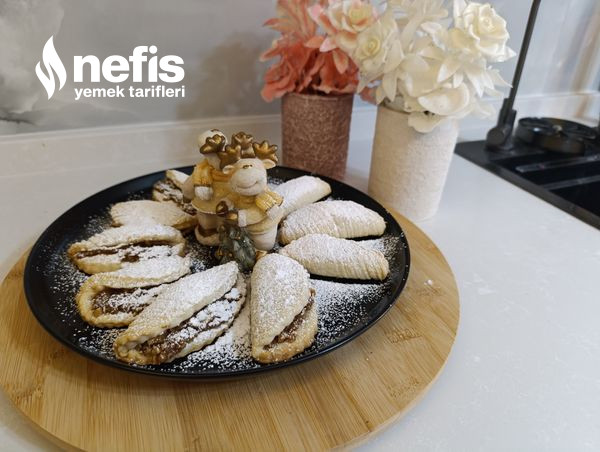 5. Daha sonra aksisini çevirip iç kısmına elmalı harçtan koyalım ve güzelce ağzına yarım ay halinde kapatalım.
