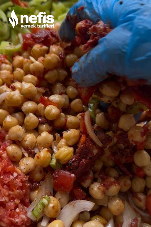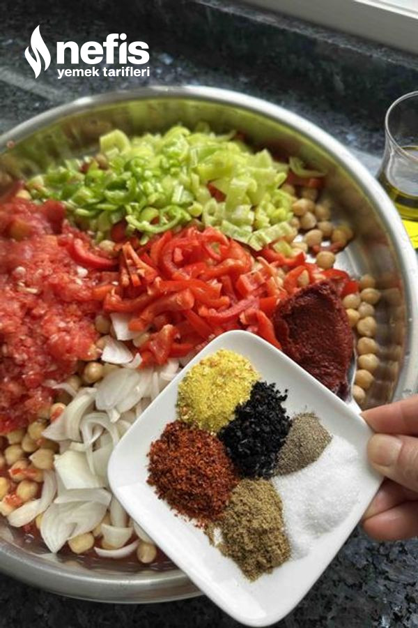 - Doğradığınız tüm materyalleri, salça, baharatlar ve yağı nohudun üzerine aktarıp karıştırın, su eklemeyin! üzerine fırına kağıdı kapatın.