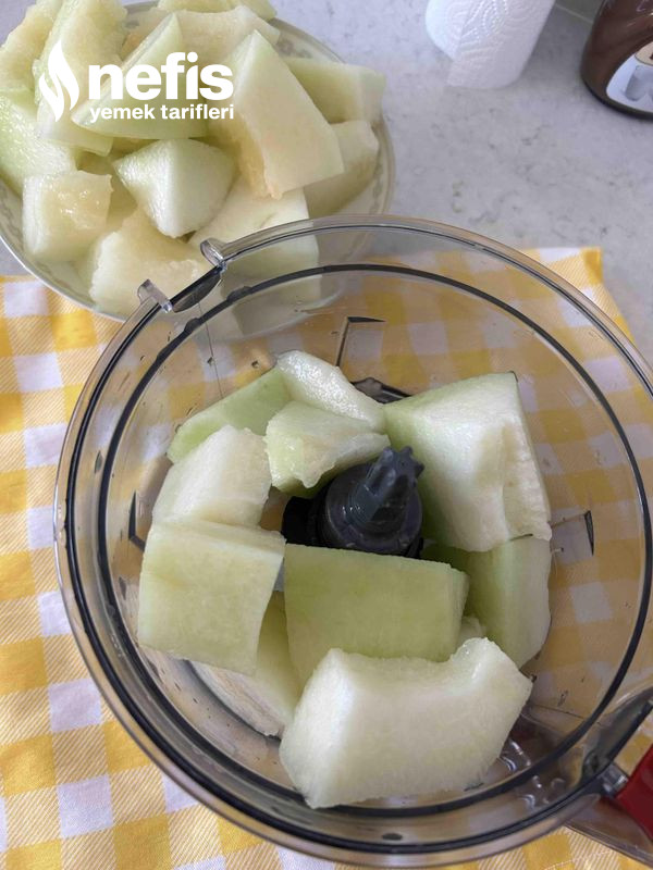 1. Kavunu güzelce yıkayalım dilimlere ayırıp doğrayalım 2-3posta halinde mutfak robotundan geçirelim son postayı geçirirken nişastayı ekleyelim.