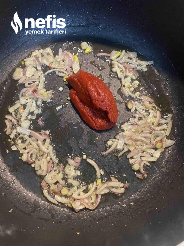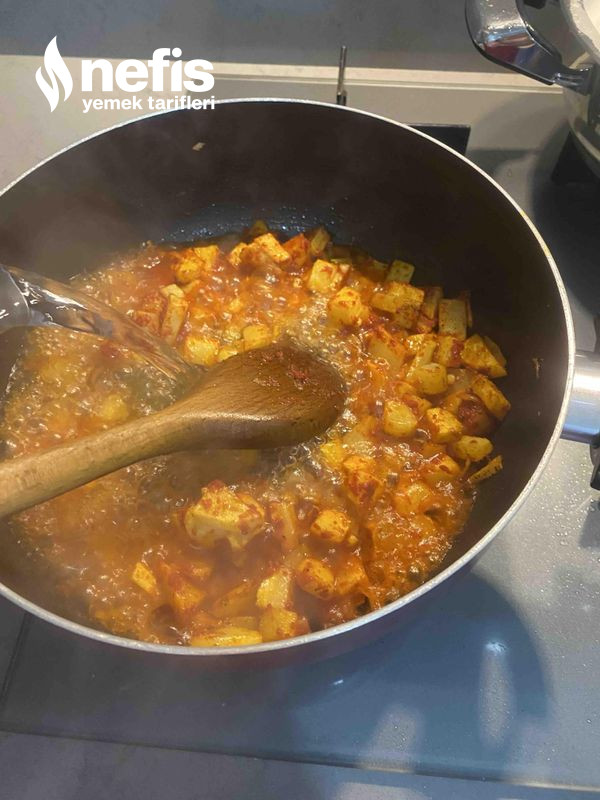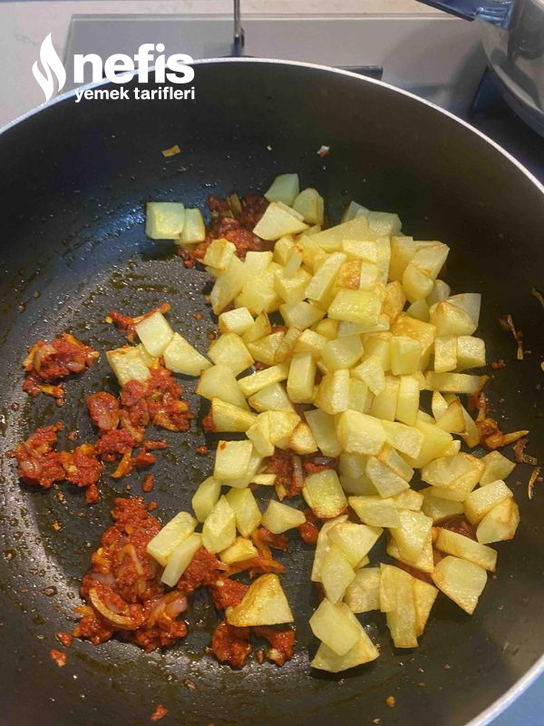 - Kavrulan soğanın içine salçayı ek ediyoruz, onu da kavurduktan sonra patatesleri tekrar tencereye döküyoruz.