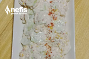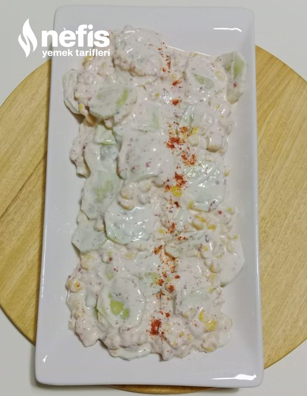 - Salatalıkları yıkayıp, kabuklarını soyup, ince yuvarlak dilimleyin yoğurtlu harca dilimlenmiş salatalıkları ve son olarak konserve mısırı ekleyip karıştırın.