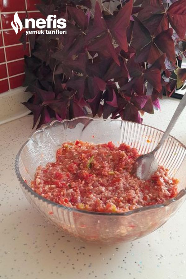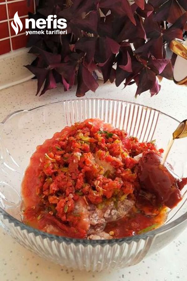 3. Salça, yağ, baharatlar, tuz ve suyu ekleyip karıştıralım.