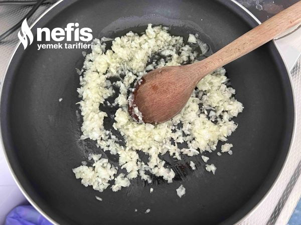- 2 yemek kaşığı zeytinyağını, rondadan geçirdiğimiz soğan ve sarımsağı teflon tavada kavuruyoruz.