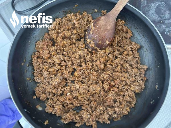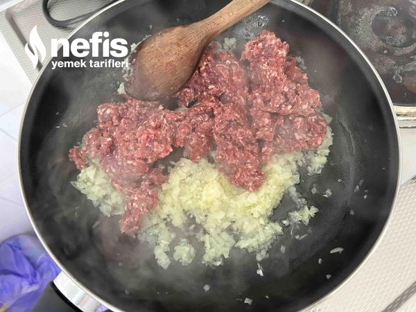 - Kavurduğumuz soğanlara 250 gram az yağlı kıymayı ekliyoruz. Kavurmaya devam ediyoruz.