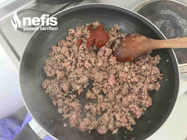 - Kıyma ve soğan, sarımsak özleştikten sonra 1 yemek kaşığı tatlı biber salçasını ekliyoruz. Kavurmaya devam ediyoruz.