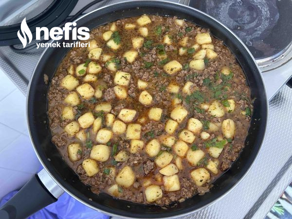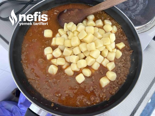 - Kavurduktan sonra 3 su bardağı sıcak su ek ediyoruz. Akabinde zar küpü formunda doğranmış patateslerimizi ekliyoruz. Karıştırıyoruz.