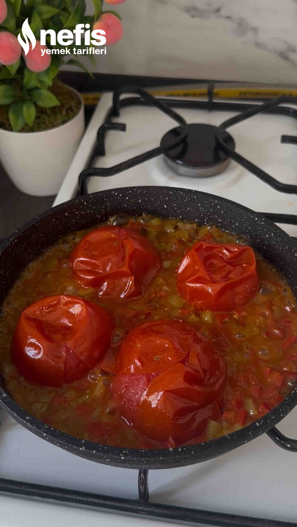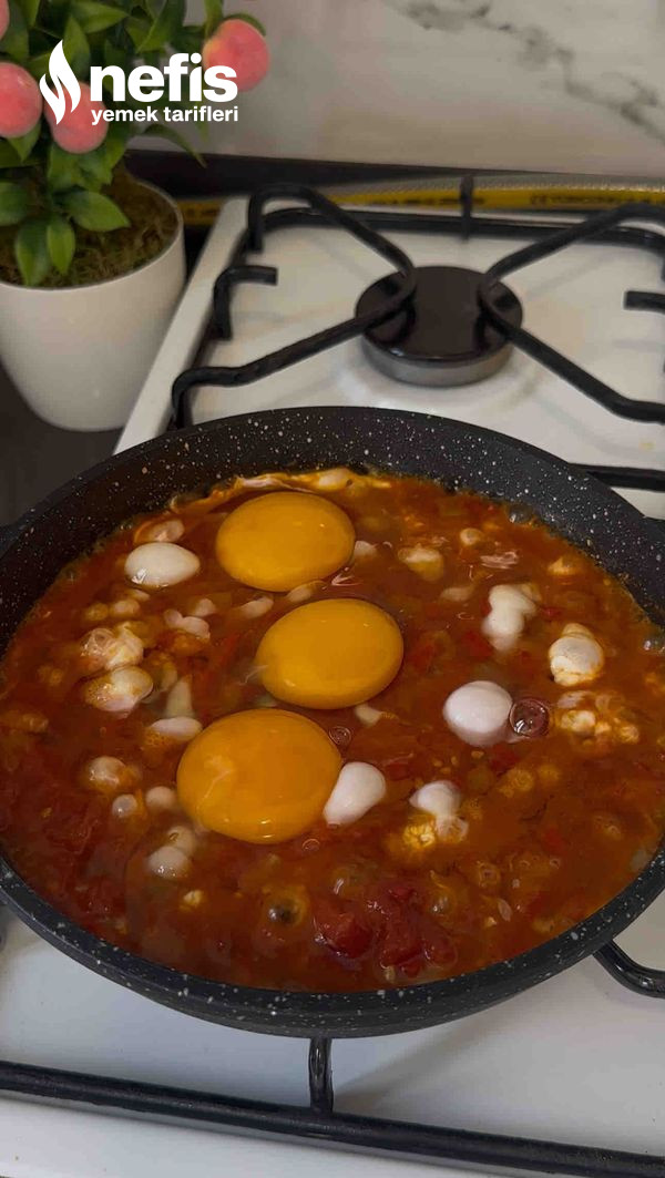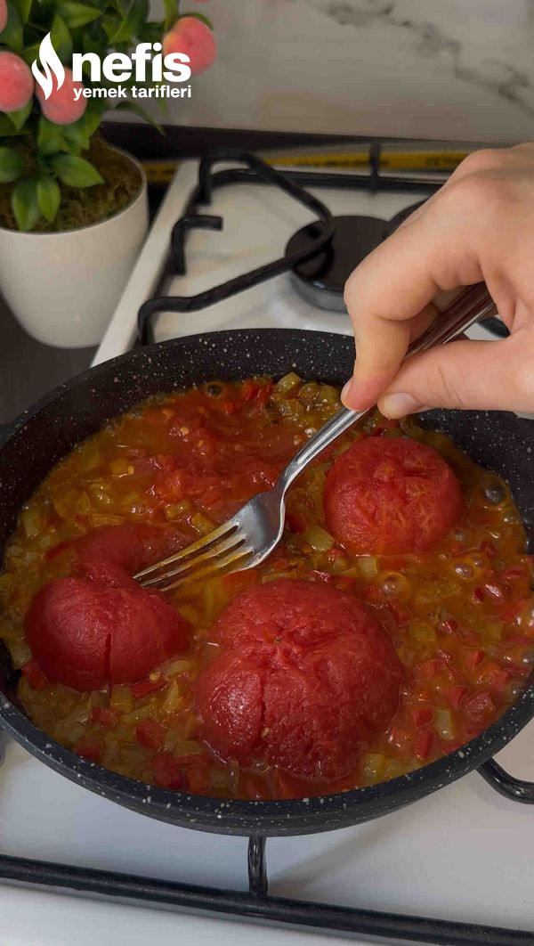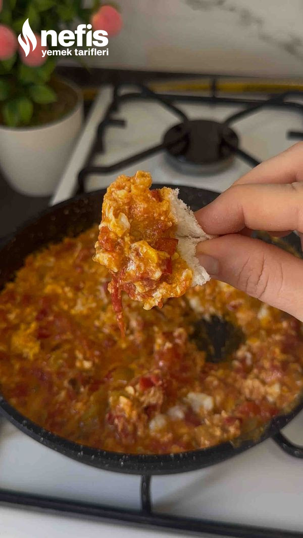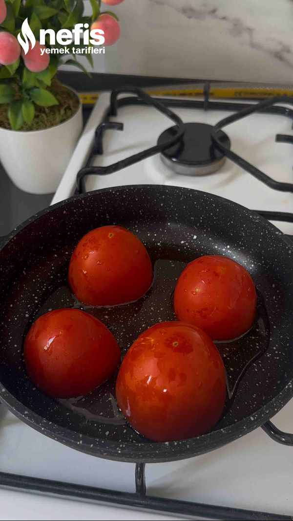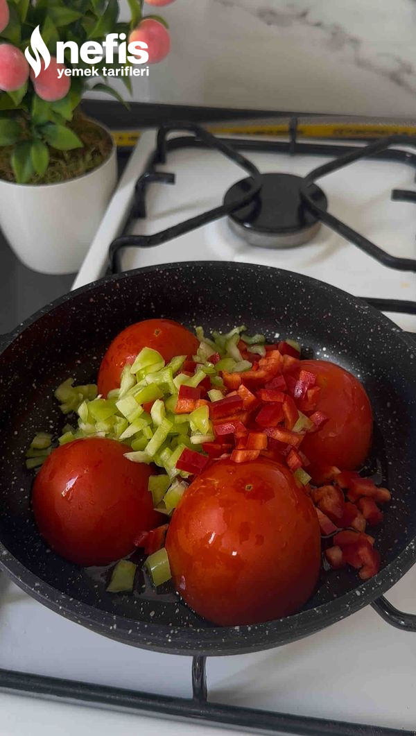 - Domatesleri ikiye bölüp yağ döktüğümüz tavaya diziyoruz. Biberleri ince ince küp küp doğrayıp domateslerin ortasına ekliyoruz. Kapağını kapatıp domatesler yumuşayana kadar kısık ateşte pişiriyoruz. Mutfak cımbızı yardımıyla pişen domateslerini kabuklarını alıp domatesleri eziyoruz. Üzerine tuz ve toz biber ekleyip karıştırıyoruz. Yumurtaları da ek edip tekrar karıştırıyoruz. Afiyet olsun.