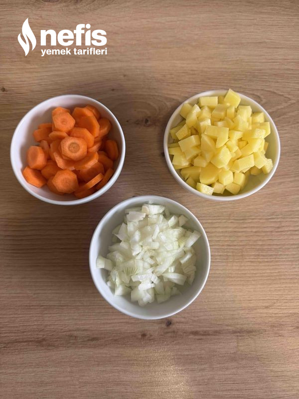 - Soğanı yemeklik doğrayın. Havuç ve patatesi küp küp doğrayın.