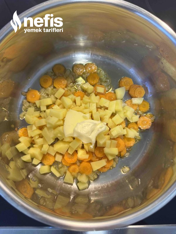 - Havuçları ek edin, 3–4 dakika pişirin. Akabinde patatesi ve tereyağını ekleyip birlikte kavurun.