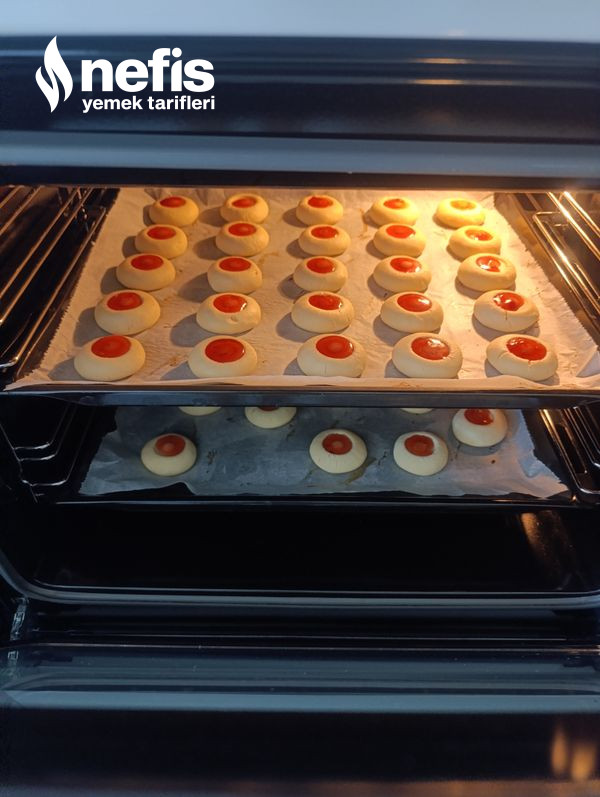 2. Ceviz büyüklüğün de bezeler alıp ortasına ortasına oklavanın uç kısmıyla bastırıp çilek reçelin den koyup tepsiye dizelim.