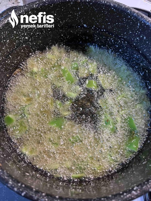 - Patatesler kızarınca pişirdiğimiz tavuklarımızın içine ekleyelim ve biberleri kızartmak için kızartma tenceremize ekleyip 1 çay kaşığından az tuz dökelim ve kızartalım.