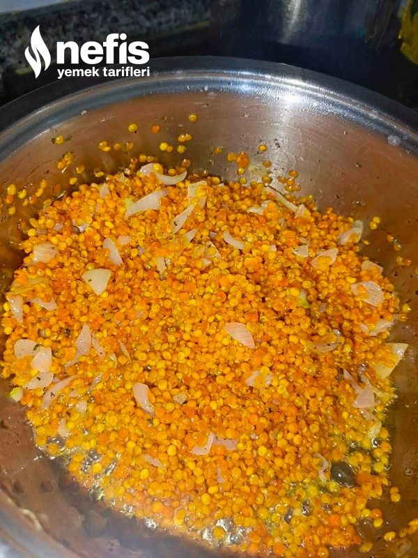 - Öncelikle soğanı biraz kavurup mercimek eklenir kısık ateşte kırmızı mercimek sapsarı olana kadar kavrulur .