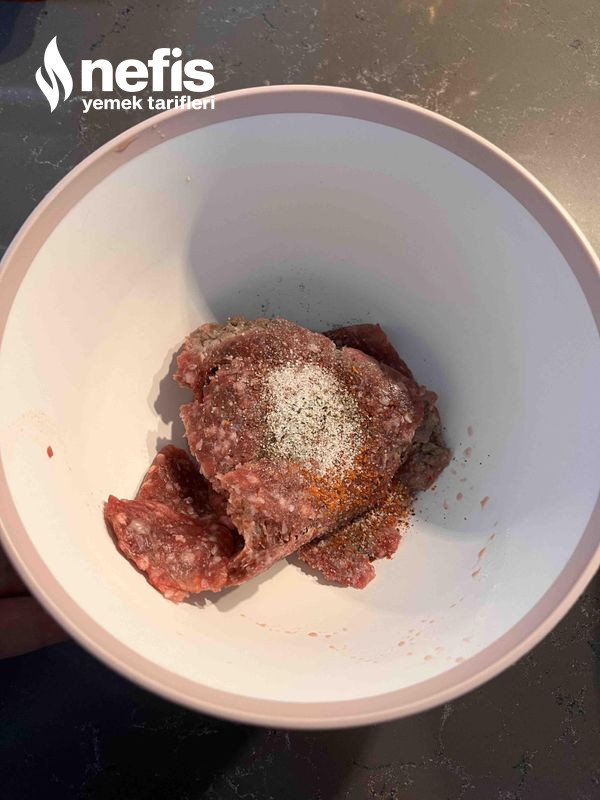 - Milföyler çözülürken kıymamızı alıp içine tuz, karabiber, pul biber,toz kırmızı biber ve bir kaç damla yağ ekleyip ister kaşık ile karıştırabilir isterseniz de eliniz ile yoğurabilirsiniz.