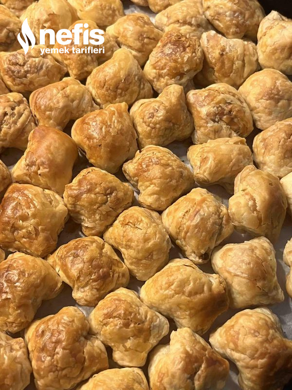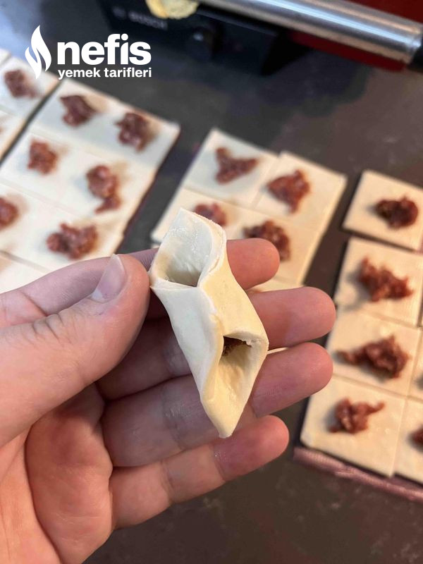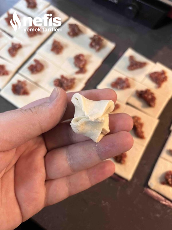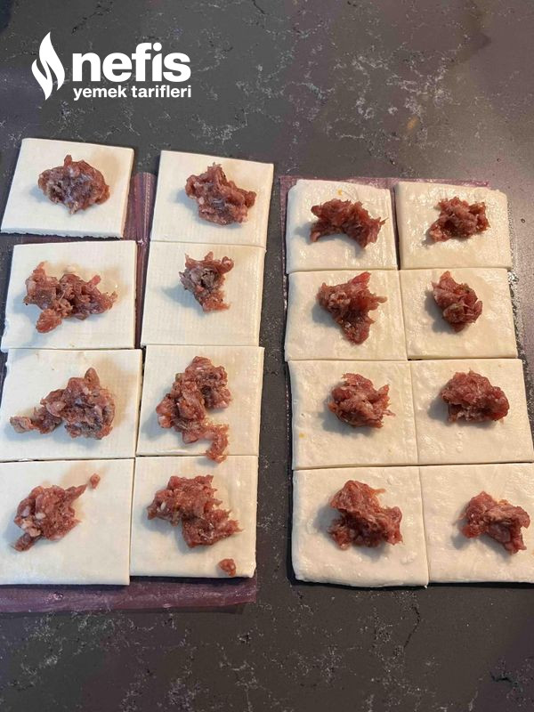 - Her bir milföy hamurunu 8 modüle ayırdıktan sonra kıyma karışımını hepsine eşit olacak halde dağıtalım.