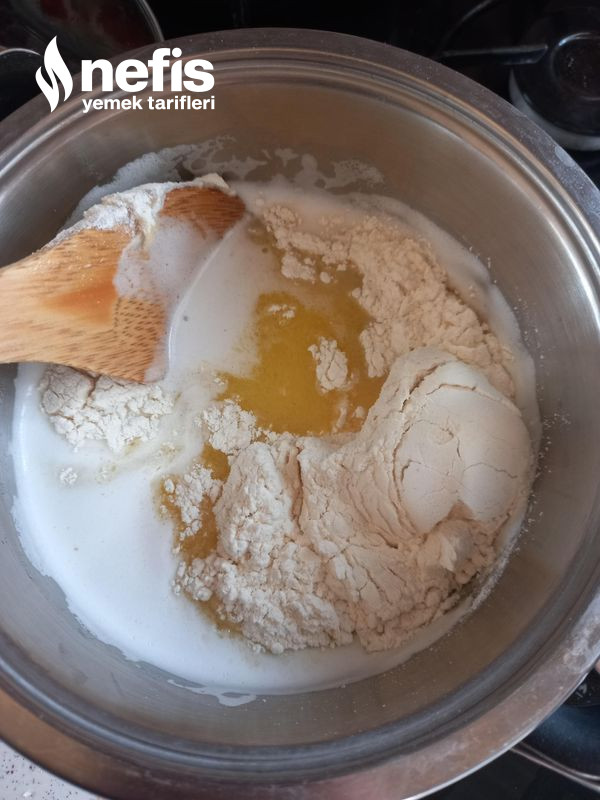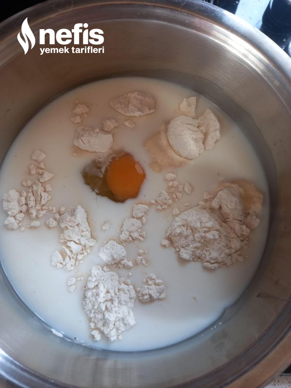 - Diğer yandan kreması için bir tencereye süt,un,şeker ve yumurtayı ekleyip pişirelim piştik sonra bir paket şekerli vanilini ekleyelim.