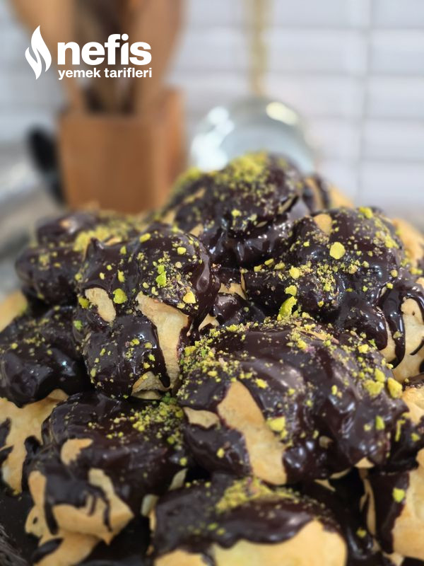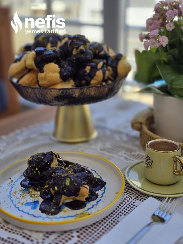 - Hazırladığınız supangle şekli çikolata sosunu kremalı profiterollerin üzerine çokça gezdirerek servis yapın.