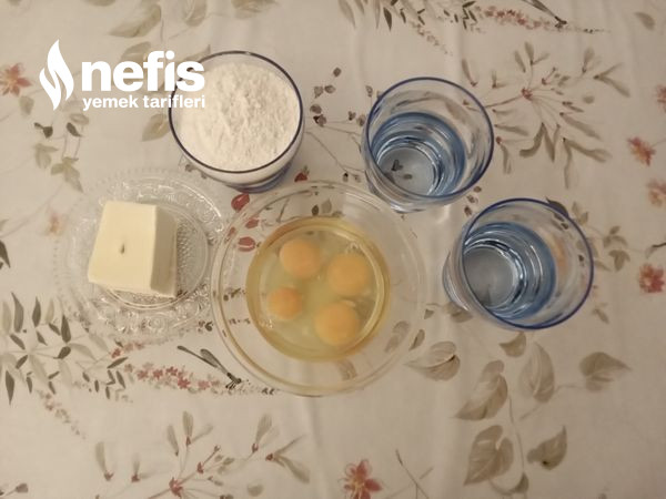 1. Hamur için; su ve margarin birlikte kaynatılır elenmiş un ek edilir ,ateş kısılarak karıştıra karıştıra hamur kıvamına getirilir ılıması için bekletilir.