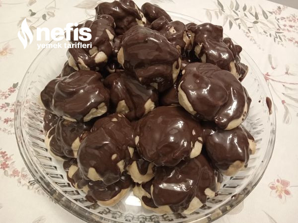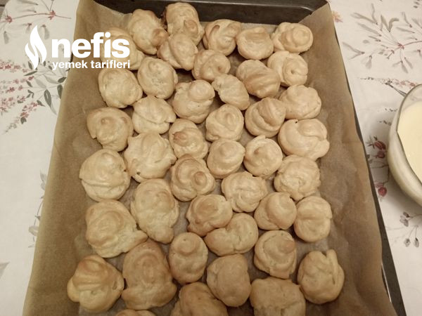 2. Ilınan hamura yumurtalar kırılarak karıştırılır bu evrede pürüzsüz olması için mikser kullanılabilir yağlı kağıt serilmiş tepsiye kaşıkla yahut krema torbasında ceviz büyüklüğünde hamurlar sıkılır 200 derece fırında pişirilir.