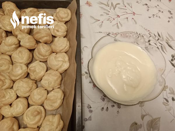 4. Krema için; yumurta, şeker, un ve süt birlikte karıştırılarak yoğunlaşıncaya kadar pişirilir, ateş kapatılıp vanilya eklenir, 2 yemek kaşığı süt kreması eklenip mikserle karıştırılır (krema daha yumuşak kıvama kavuşur) hamurların alt kısmı çay kaşığı yardımıyla açılır içine hazırlanan krema doldurulur.