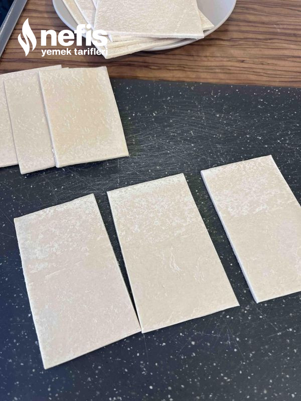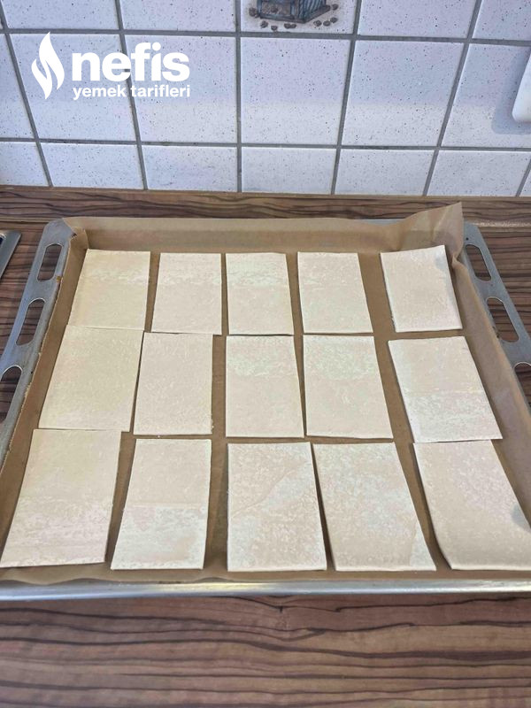 4. Milföyleri 3 kesime kesip yağlı kağıt serili fırın tepsisine dizelim.