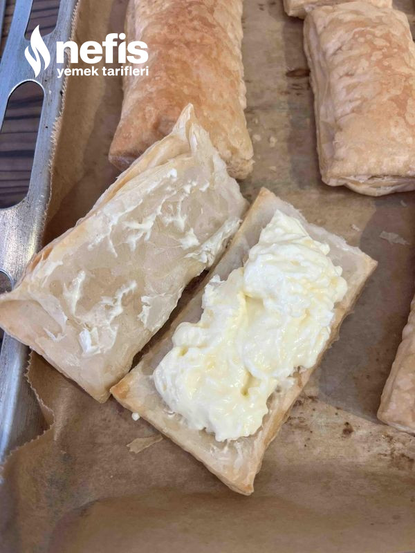 6. Pişen milföylerin birinci sıcağı çıktığı vakit ortalarından bölelim ve karışımdan yerleştirelim.