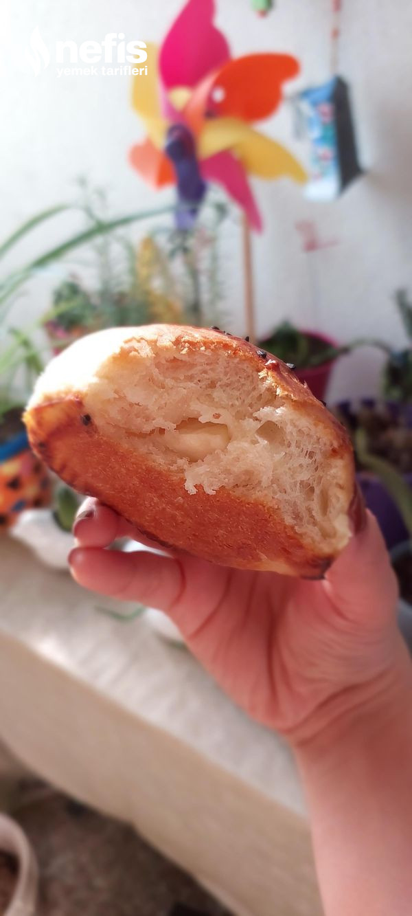 6. Mayalanan hamurdan yumurta büyüklüğünde kesimler kopartıp avuç içinizde yuvarlayarak form verin. İçerisine peynirli harç koyup yuvarlak formda kapatın.