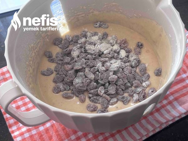 - Ayrı bir kaseye bir bardak çekirdeksiz kuru üzüm ve bir silme yemek kaşığı unu alarak karıştırıyoruz ve kek harcının içine ek ederek kaşıkla karıştırıyoruz ( hafif katı kıvamlı bir kek harcı oluyor)