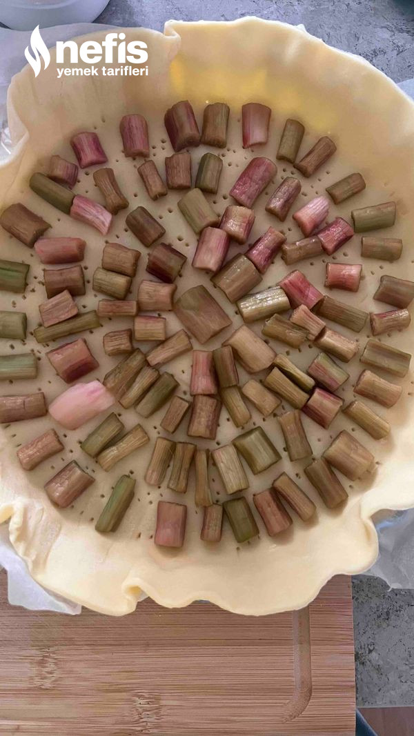 3. Tart hamurunun üzerine raventleri dizelim. Üzerine hamuru dökelim ve evvelden ısıtılmış 170°de olan fırında pişirelim. Üzeri kızarınca fırından alalım.