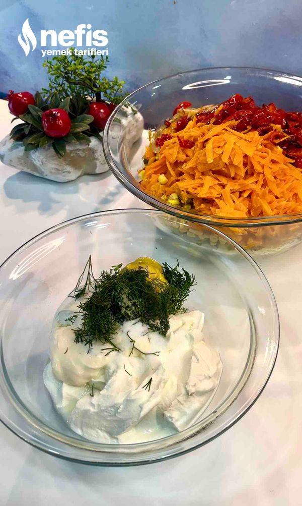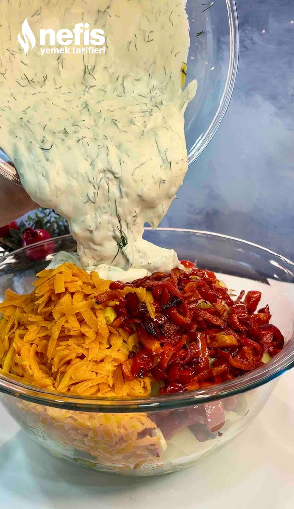 - Servise yakın hazırladığımız yoğurtlu sosumuzu üzerine ekleyip nazikçe harmanlayalım.