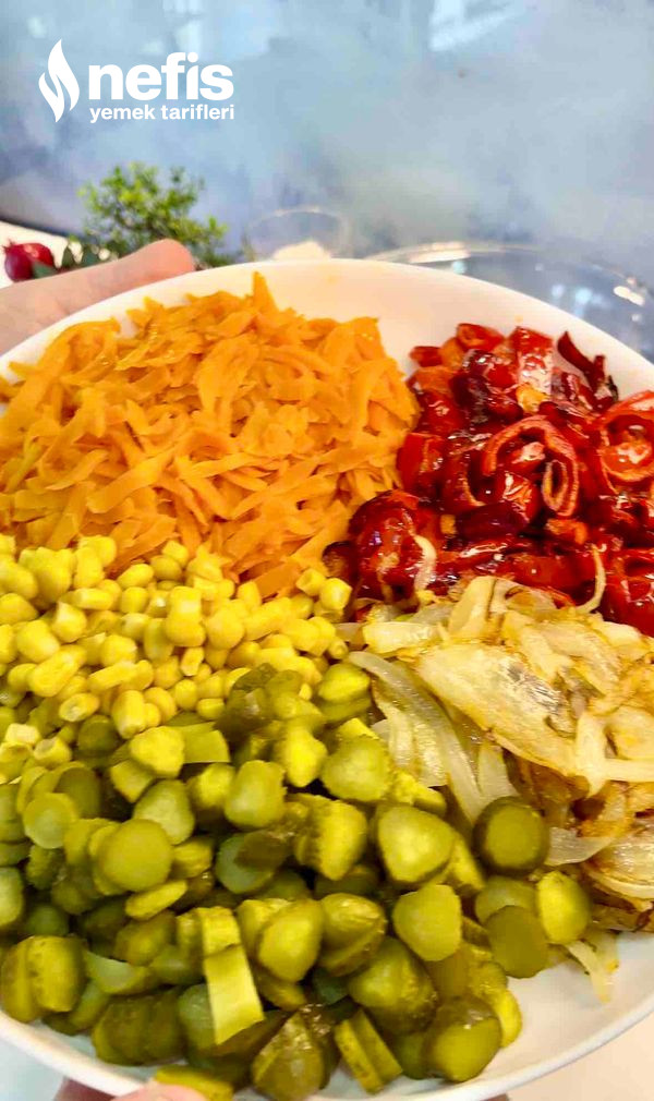 - Büyükçe bir kapta patatesleri, sote zerzevatları, turşuyu, mısırı ekleyip karıştıralım.