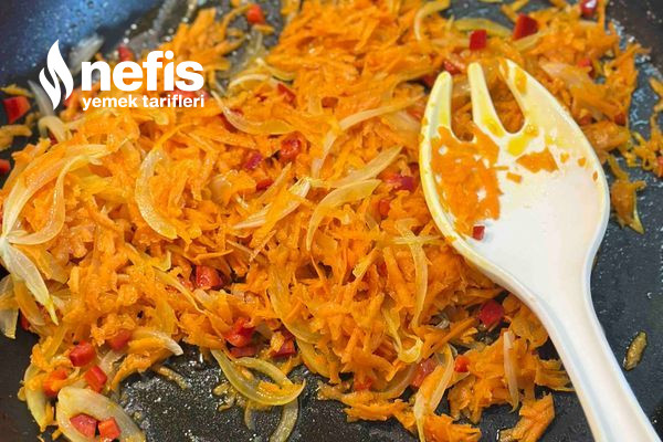 - Tavayı yağlayıp sırasıyla evvel soğanı, sonra kapya biberi, en son da rendelenmiş havuçları soteleyin.